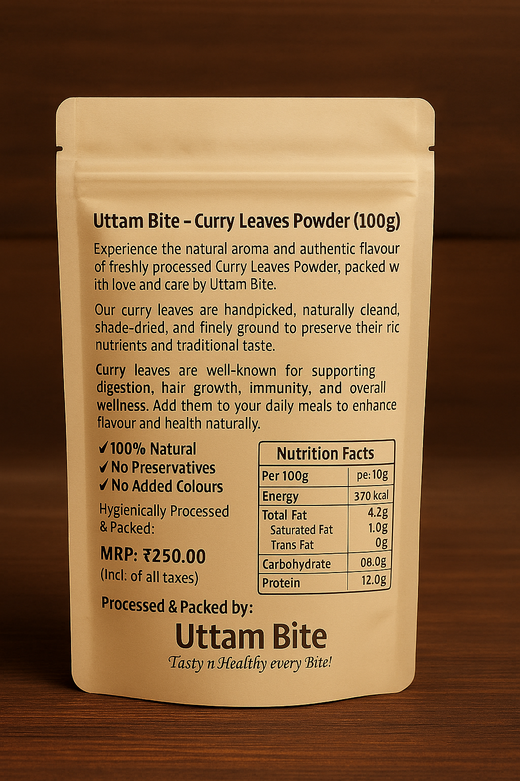 Experience the natural aroma and authentic flavour of freshly processed Curry Leaves Powder, packed with love and care by Uttam Bite.